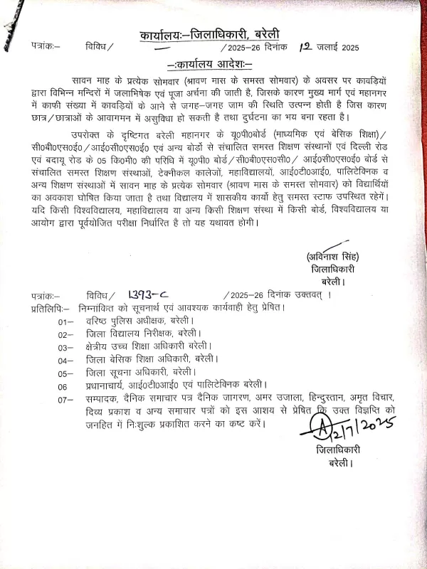 इसको दृष्टिगत रखते हुए बरेली महानगर के यू०पी०बोर्ड (माध्यमिक एवं बेसिक शिक्षा), सीबीएसई, आईसीएसई एवं अन्य बोर्डों से संचालित समस्त शिक्षण संस्थानों एवं दिल्ली रोड एवं बदायू रोड के 05 किलोमीटर की परिधि में यूपी बोर्ड, सीबीएससी, आईसीएसई, बोर्ड से संचालित समस्त शिक्षण संस्थाओं, टेक्नीकल कालेजों, महाविद्यालयों, आईटीआई, पालिटेक्निक व अन्य शिक्षण संस्थाओं में सावन माह के प्रत्येक सोमवार (श्रावण मास के समस्त सोमवार) को विद्यार्थियों का अवकाश घोषित किया जाता है। साथ ही विद्यालय में शासकीय कार्यों हेतु समस्त स्टाफ उपस्थित रहेंगे। यदि किसी विश्वविद्यालय, महाविद्यालय या अन्य किसी शिक्षण संस्था में किसी बोर्ड, विश्वविद्यालय या आयोग द्वारा पूर्वयोजित परीक्षा निर्धारित है तो यह यथावत होगी।